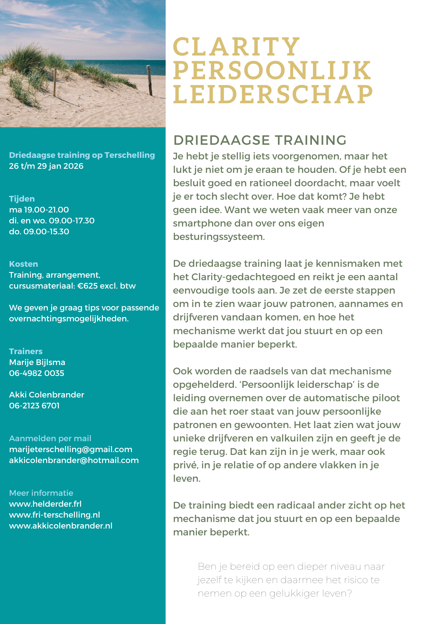 • *de 2-daagse training Zicht op Helderheid op 28 en 29 maart 2026 in Amsterdam.